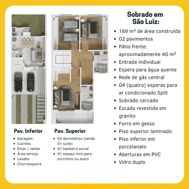 Piso porcelanato, laminado, rebaixe em gesso, esquadrias em PVC, vidros duplos